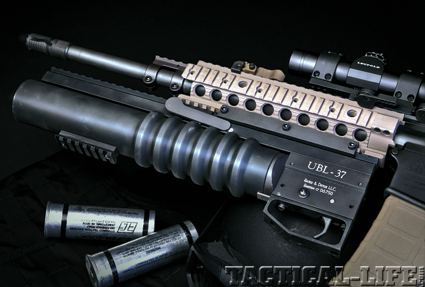 The entirely American-made UBL-37 is best thought of as a re-creation of the military M203 military grenade launcher—not an exact copy. If you have worked with the military M203, you will find some distinct differences. The first is the chambering. The M203 is a 40mm weapon, capable of and designed for firing high-explosive defensive rounds. Bates & Dittus’ UBL’s 37mm chambering is design-ed for the launching of less-lethal rounds—originally various forms of tear gas for crowd control. High-explosive 40mm rounds can’t be chambered or fired from this weapon.
