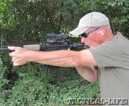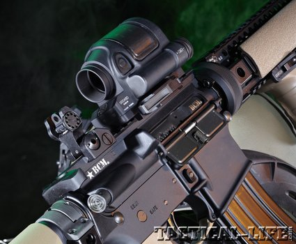 Capable of being used with night vision, the Micro T-1 weighs a mere 3.7 ounces and is parallax free. Smaller than the palm of your hand, the T-1 is a 1X optic, meaning it offers no magnification, which is fine. The general rule of thumb is to have 1X magnification for every 100 yards the weapon will likely be used in. For law enforcement purposes, the T-1 alone will likely be fine, but if a longer shot is needed, some type of magnification would certainly be desirable. Also, wanting to maximize the accuracy of the BCM carbine, I opted for Aimpoint’s equally outstanding 3X Magnifier unit. This small tube fits just to the rear of the Micro T-1 and aligns perfectly, giving the shooter a 3X red-dot scope. It comes with a hinged mount that allows it to be rotated out of the way quickly if a close-quarters shot is needed. This combination might very well be the optimal system for a combative carbine.