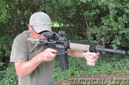 Quality is readily apparent throughout the EAG Tactical Carbine. The upper is machined from a 7075-T6 aluminum forging and is hardcoat anodized. The flattop receiver with a Picatinny rail allows the mounting of a variety of optics or a standard carry handle. A Troy Industries/BCM folding battle sight comes standard on the upper rail. The mid-length gas system, one many knowledgeable shooters believe is the most reliable, is surrounded by a 9-inch, free-floated LaRue Tactical handguard, which is also a rail system in itself.