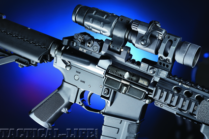 Strict adherence to military specifications and BCM’s reputation for quality should help the new RECCE line of rifles find their way into the hands of the armed professionals of our country. The RECCE shown here is fitted out with a SureFire light, an Aimpoint red dot sight with 3X Magnifier and a TangoDown vertical foregrip.