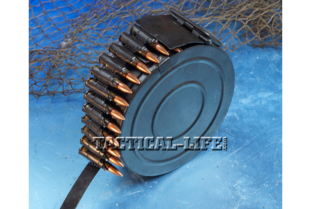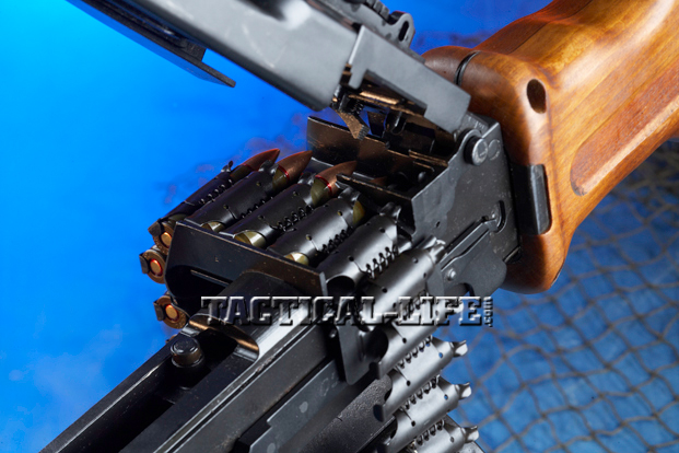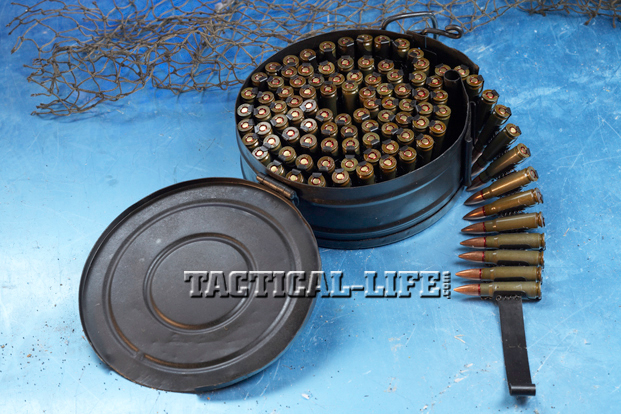 With two 100-round drums ready to go, I headed to the range to try the RPD. Loading the belt into the RPD is rather easy. Actually, the belt may be loaded in one of two ways—with the receiver cover closed or open. I had learned to do it with the cover open and did so in that manner. One of the two 50-round belts, which are linked in the drum, came with a tongue that sticks out of the drum. To load, it is pulled through and the first round is pressed into position against the stop, then the cover is pushed home smartly to be sure it locks. At this point, the bolt may be pulled back and a round chambered. On a real full-auto RPD, the bolt would lock back, as it is an open bolt gun—but on the DS Arms RPD, a semi-auto, the bolt goes forward.
