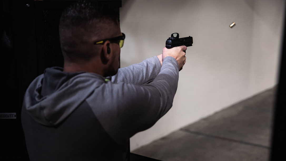 After that little side trip down memory lane, this writer donned some ear and eye pro and got busy shooting. The group divided up into groups and an informal competition ensued. Even though my shooting skills have diminished with age, I was still able to keep most shots in the 9, 10 and X ring out to 18 yards with the clock running. The pistol I shot wore a Burris FastFire optic, while others were outfitted with Steiner red dots. Through the first 50 rounds of 9mm hardball I consistently scored in the low 90s for every 10-round target.