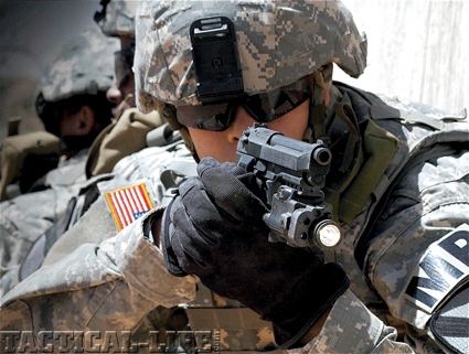 The Beretta 9A1 with light mounted, in use by a U.S. Military Policeman. This version of the M9 has been adopted by the USMC and by special operations units.