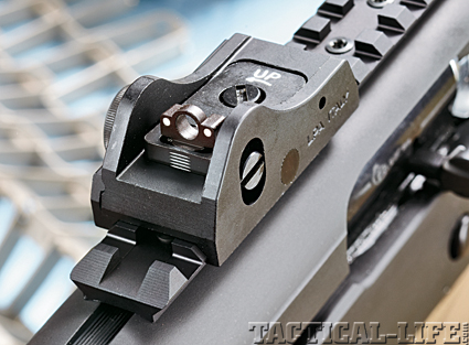 The rear sight is an LPA ghost ring assembly adjustable for windage and elevation, and features sturdy protective wings.