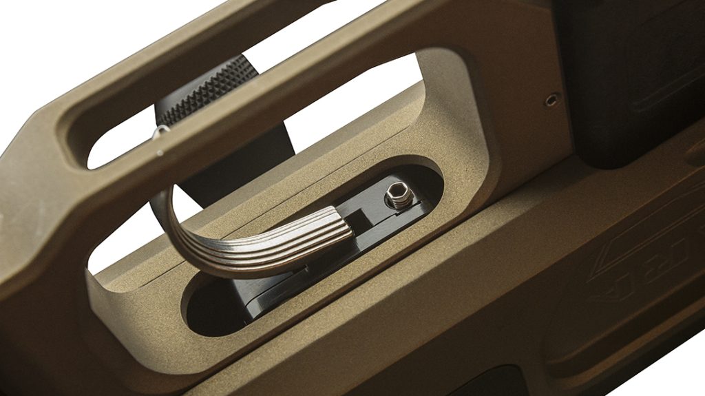 One of the rarer materials used in fabrication, magnesium is 33 percent lighter than aluminum and 75 percent lighter than most steel. Therefore, when you pick up the MgLite, you’ll nearly launch it through the ceiling. That’s because, in addition to replacing aluminum with magnesium, it also replaces steel with carbon fiber—well, mostly. The barrel on the MgLite features CURE technology, which interweaves steel and carbon fiber to produce a lightweight barrel that dissipates heat more efficiently than other designs. Carbon fiber is also used extensively in the buttstock and pistol grip to yield a precision rifle that weighs less than 6.5 pounds. Lastly, every bit of material that can be removed is, as witnessed in the fluted bolt, relieved knob and skeletonized triggerguard and grip.
