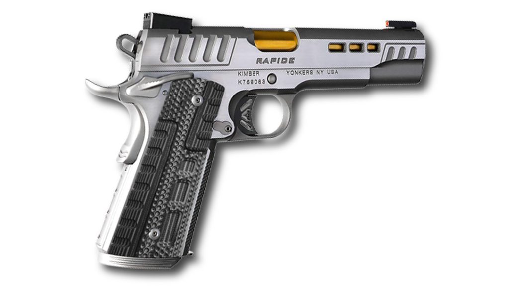 The Kimber RAPIDE (Dawn) is a unique take on the 1911. Constructed of stainless steel, the frame features the Kimpro II Silver finish, set off by the brushed stainless and Kimpro II finish of the slide. Housed within the slide is a stainless steel, match-grade barrel with a gold finish, beautifully showcased through the slide cuts and ejection port.