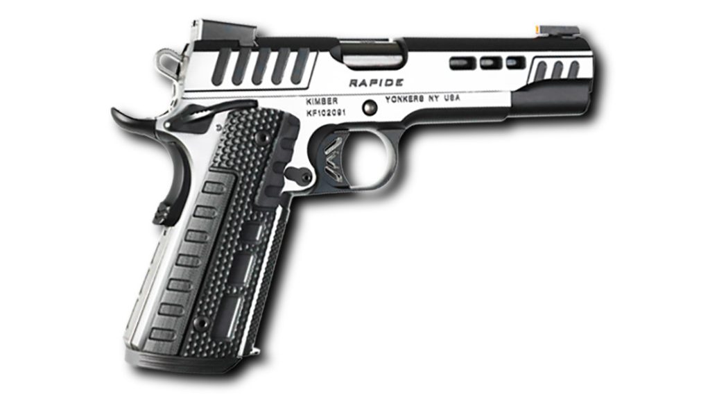 The Kimber RAPIDE (Scorpius) is essentially a larger version of the (Dawn) with some slight variations. Like the (Dawn) the (Scorpius) is constructed of stainless steel. However, both the frame and slide feature the Kimpro II black finish with brush polished flats. The slide houses a 5-inch stainless steel match-grade barrel with black DLC finish and match-grade bushing.