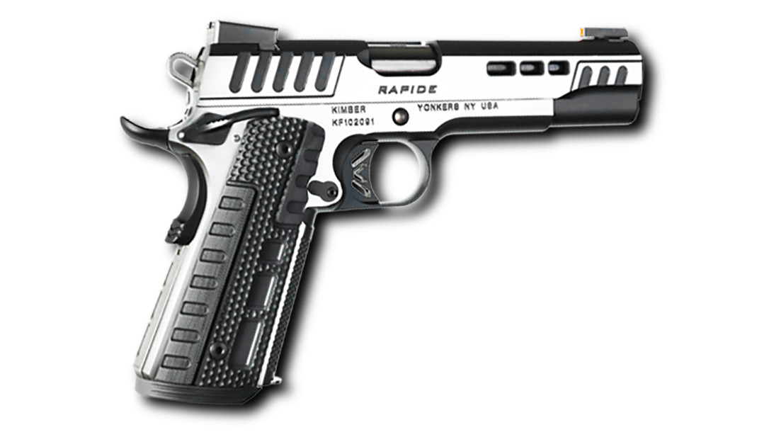 The Kimber RAPIDE (Dawn) is a unique take on the 1911. Constructed of stainless steel, the frame features the Kimpro II Silver finish, set off by the brushed stainless and Kimpro II finish of the slide. Housed within the slide is a stainless steel, match-grade barrel with a gold finish, beautifully showcased through the slide cuts and ejection port.