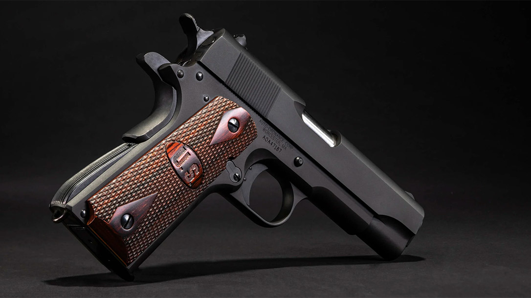 The carbon steel frame and slide feature a matte black finish to reduce glare. The carbon steel slide, sear, and disconnector are all machined from solid bar stock, and heat-treated for durability. Atop the slide is a blade front sight and rear drift sight, adjustable for windage. Although it ships standard with brown plastic grips, checkered wood grips with U.S. Logo are available.