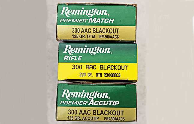 Big Green has three 300 AAC loadings that feature low-flash powder suitable for suppressed and SBR fire and include waterproofed primers and crimped and cannelured open-tip bullets. Offerings include the 125-grain OTM, the 220-grain OTM, and the 125-grain AccuTip round. Remington also offers two UMC 300 BLK loads, a 220-grain subsonic and a 120-grain supersonic.