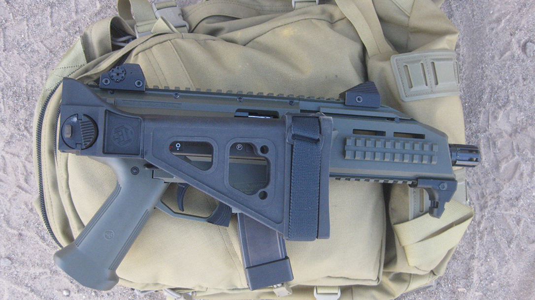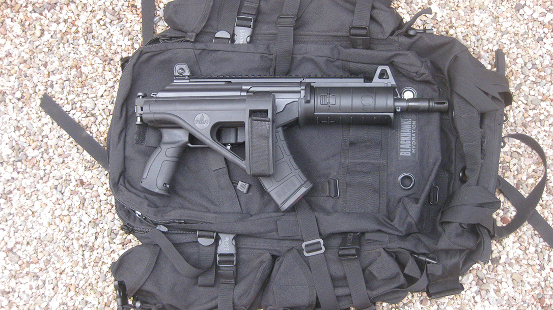 Two of the most compact, rugged and reliable heavier-caliber backpack firearms are the IWI Galil ACE Pistol with an 8.3-inch barrel and a side-folding stabilizing brace in 5.56mm NATO caliber (7.3 pounds empty) and the Galil ACE Pistol in 7.62x39mm that weighs 7.2 pounds unloaded. Galil ACE Pistols have an overall length of 26.75 inches. They use the same Magpul PMAGS that reliably operate in AR-15s/M4s and AK-47 rifles. IWI equips its Galil ACE Pistols with AR-15-style tritium sights. They also have a Picatinny rail that can accommodate a red-dot optic. Always remember that it’s critically important to wear hearing protection when you fire or operate any firearms, especially short-barreled shotguns or any of the short-barreled .223/5.56mm NATO and .30-caliber firearms.