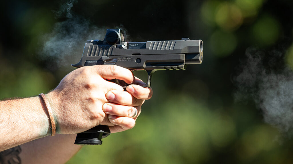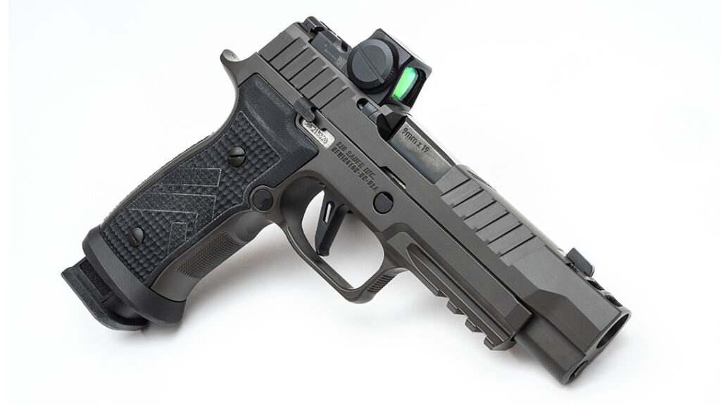 The P320 AXG Legion is imbued with a distinct, militaristic flair with its Legion Gray grips and metal treatment. Aggressive fore and aft slide serrations further enhance this bearing. A Picatinny accessory rail and the prodigious capacity of the three 21-round magazines add to the appeal. The two-port expansion chamber milled into the slide forward of the 3.9-inch barrel’s muzzle mitigates recoil much in the same way as a compensator on a barrel. The slide also includes an optics cut and Sig’s superb X-Ray3 day/night sights.