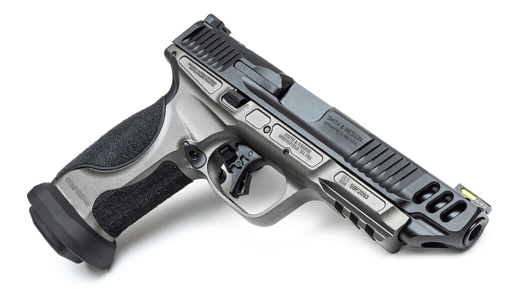 Even so, there’s another player in the striker-fired competition arena, and that’s the Smith & Wesson Performance Center M&P 2.0 Competitor. Building off its M&P 2.0 Metal series, the company took the series to the next level with a full suite of competition-specific features. With an MSRP of $999, the Competitor comes from the factory with a 5-inch barrel and a slide that features snazzy styling along with lots of lightening cuts to shift the recoil balance point in the hand. The slide also features a fiber-optic front sight with a blacked out and serrated rear sight, and it includes an optics cut that can accept a variety of red-dot units on the market with different adapter plates.