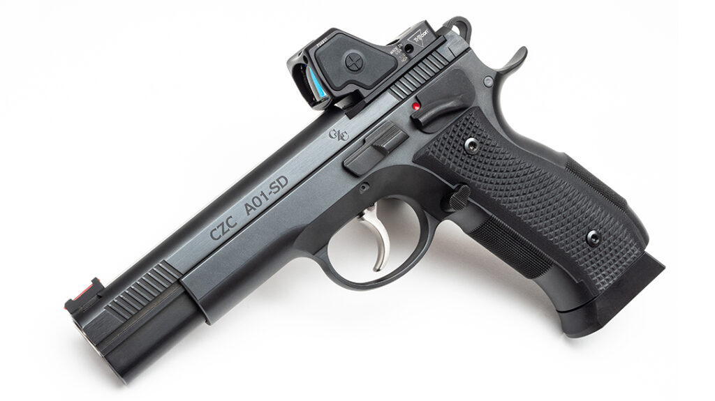 Styled after the original CZ 75, the A01-SD OR features the same great ergos and design cues that include an undercut trigger guard and a deep relief under the beavertail for a high grip on the pistol. That frame features 25-line-per-inch checkering and an internal mag well to speed up reloads. A fiber-optic front sight and low-mount rear sight adorn the slide in addition to an optics cut that can work with a variety of platforms via different adapter plates.