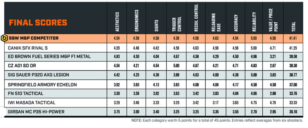 Drawing comparisons between big-ticket pistols, competition guns and EDC pieces can sometimes be a tricky proposition. We try to be as objective as we can, and as you can see from the results, in contrast to the personal favorites, I think the evaluators did a great job setting aside personal biases and letting the chips fall where they may. For this year’s Ballistic’s Best of Full-Size pistol, fortune favored the Smith & Wesson Competitor, and it most definitely earned every single point in its final score.