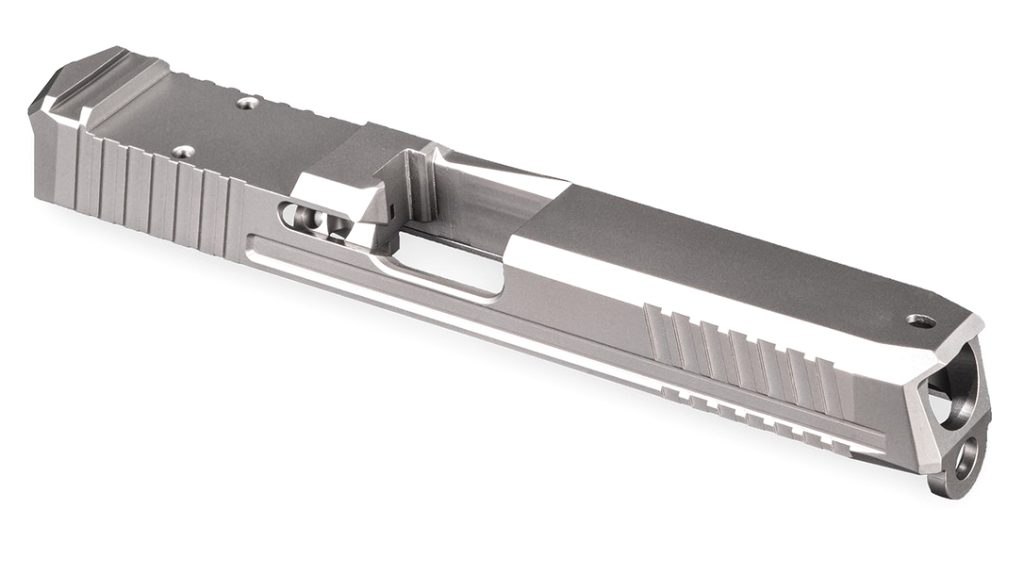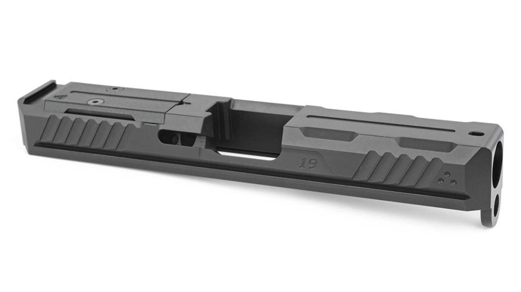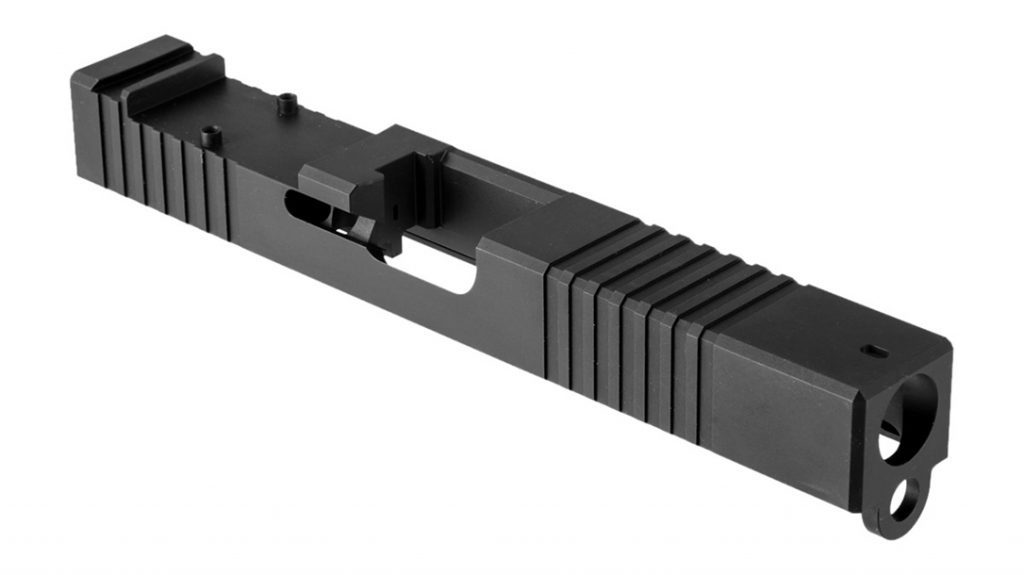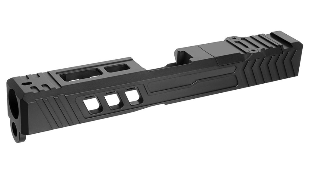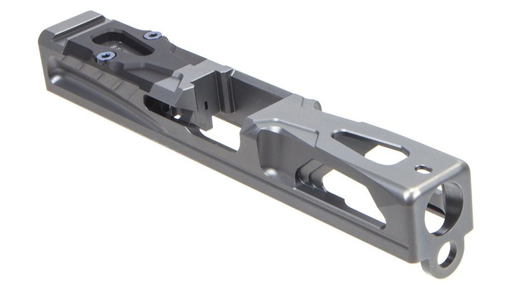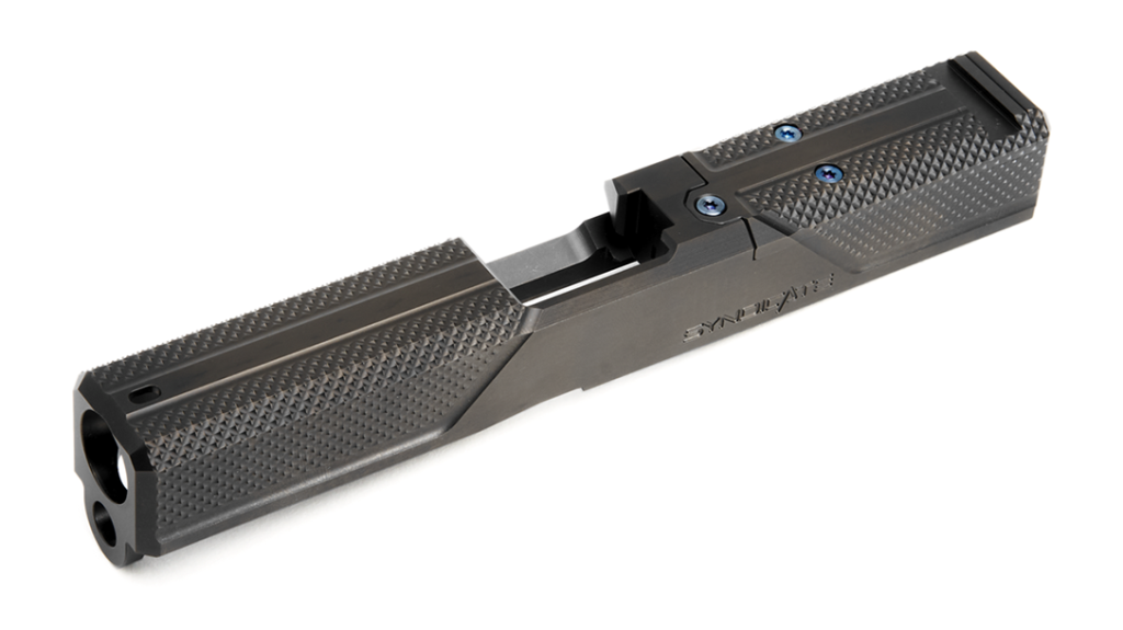 First up, we have an offering form Agency Arms. The Syndicate slide includes a stripped S2 slide and a recoil spring. The slide comes with the company’s well-designed Agency Optic System. This optics system cut proves one of the most robust optic cuts available on the market. Some key features include a variety of optic adapter plates, modular rear sight placement, a wider variety of iron sights, and a very solid attachment system. These Agency slides come machine from billet 17-4 steel and coated in Diamond Like Carbon.