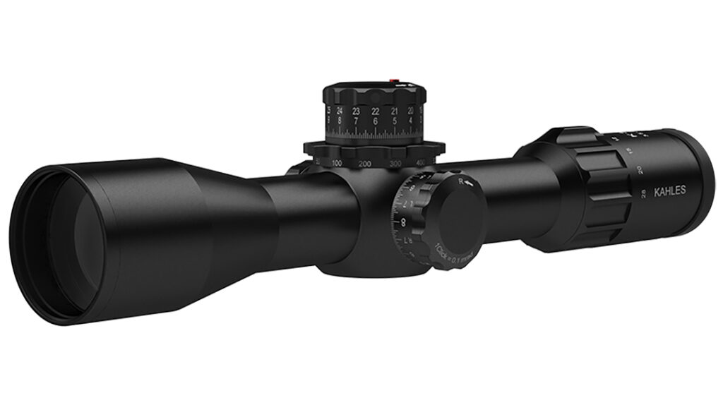 Available in March 2024, the Kahles K328i is a groundbreaking, top-of-the-line, long-distance scope. It offers 40% larger FOV than the K525i, a 36mm tube, first focal plane, windage adjustments on the left or right, parallax adjustment on the elevation turret, illuminated reticle, MRAD adjustment with positive tactile clicks, and available in a variety of reticles.