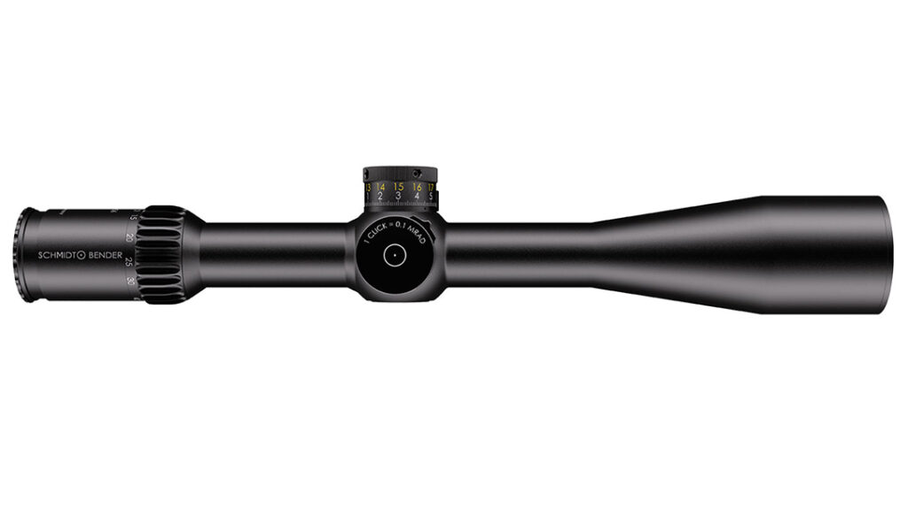 Another top-of-the-line scope for extreme long distance is the new Schmidt & Bender 10-60×56. This 34mm tube has a light transmission of over 90%. It has 11 levels of its illuminated reticle and parallax adjustment from 20 m to infinity. It is first focal plane, but a second version in second focal plane with an MOA reticle and ¼ or 1/8 MOA clicks is in the works. Current click value is .1 MRAD. It currently comes with the new M1FL reticle, based on their well known LRR-MIL reticle.