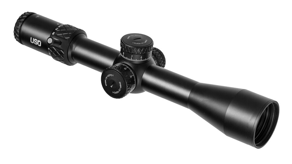 The U.S. Optics TXH 3-18x50mm comes with a 34mm tube, first focal plane, four fully illuminated reticles available, locking turrets, 30 mils of travel, 180° throw lever, EMCR reticle, and parallax adjustment from 10 yards to infinity. It will come out in the second quarter of 2024.
