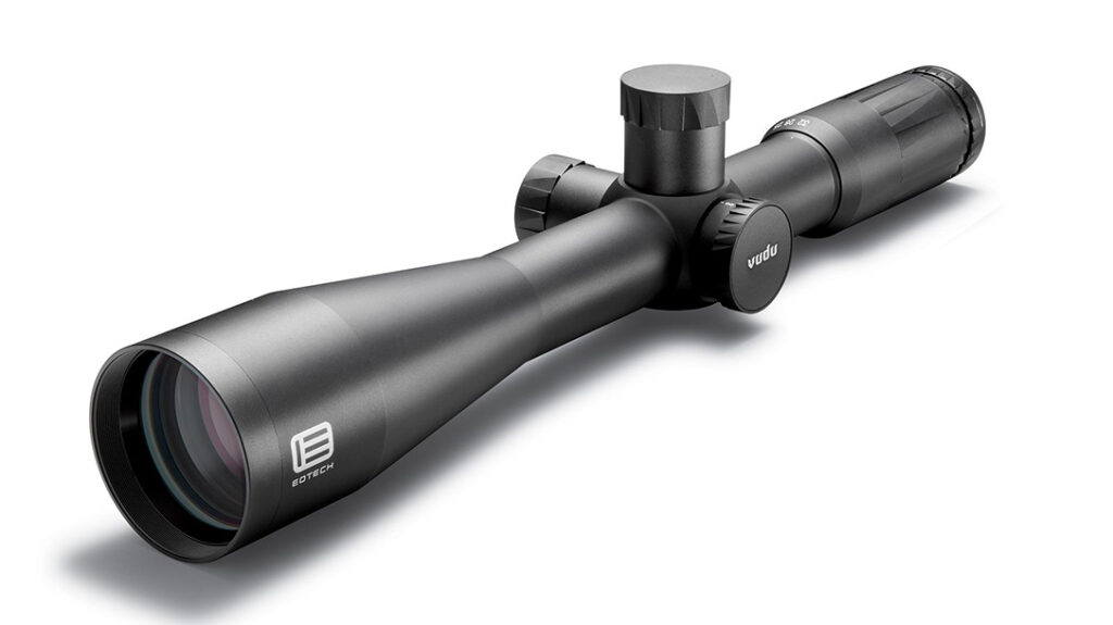 EOTech takes the Vudu into the long-range precision world with the 8-32×50 SFP. It has a 34mm tube, AR coated high-density glass at the ocular lens, CX high-density, low-dispersion glass at the ocular lens, water and fog resistant, anti-reflective coated lens, and push-button illumination controls for the center dot. Adjustments are made in .125 MOA (1/8 in) clicks for extreme precision with 100 MOA vertical travel and 80 MOA horizontal travel. The Vudu HC2 reticle has MOA-based hashmarks.