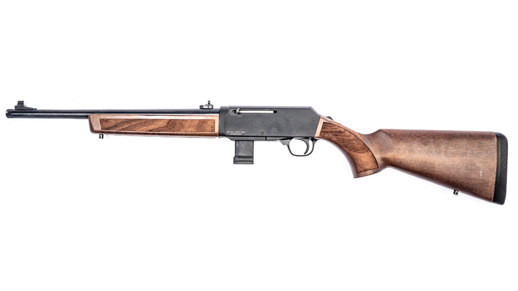 For those who prefer illuminated or magnified optics, the drilled and tapped receiver accepts a Weaver 63B base. In close quarters, the Homesteader is highly maneuverable, weighing just 6.6 pounds and under 36 inches in overall length. A reciprocating mass inside the forearm counteracts perceived recoil, enabling faster follow-up on target, inspiring confidence for the recoil sensitive. For even greater control, leather-like texturing on the genuine American walnut stocks and a soft rubber recoil pad provide non-slip contact points. (henryusa.com)