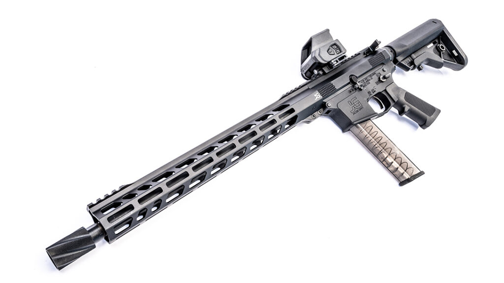 Jacob Grey has yet to become a household name, but with guns like the JG9 they are on their way. This blowback AR9 9mm pistol comes with a smooth pistol-length buffer tube and buffer/recoil spring combination tuned to reliably cycle a wide variety of ammunition. The heavy 9mm bolt also helps to increase dwell time and reduce bolt bounce ensuring a safe and smooth feeling action. Jacob Grey’s uniquely designed 9mm checkering not only adds eye-catching appeal, but the reliability and smooth functioning of the billet machined upper makes firing this 9mm pistol a pleasure. What stood out on this gun with all testers was the great trigger. To say it is fast is an understatement. Combined with great fit and finish, the gun is a pleasure to run. (jacobgreyfirearms.com)