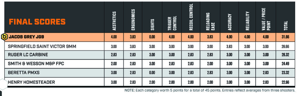 The testing parameters are provided to us by the Ballistic editorial staff and are straightforward. Each category covered something that people in the PCC market look for. The scale–set at 0 to 5–opened at 3. That means every gun came in as a 3 and gained or lost points as the evaluation went on. The only major score drop was in the category of sights. A gun arriving without any backup sights automatically took a deduction in score to zero in that category. The rest of the categories, including value, are self-explanatory. For more information, please check out the “Final Scores” chart at the end of the article.
