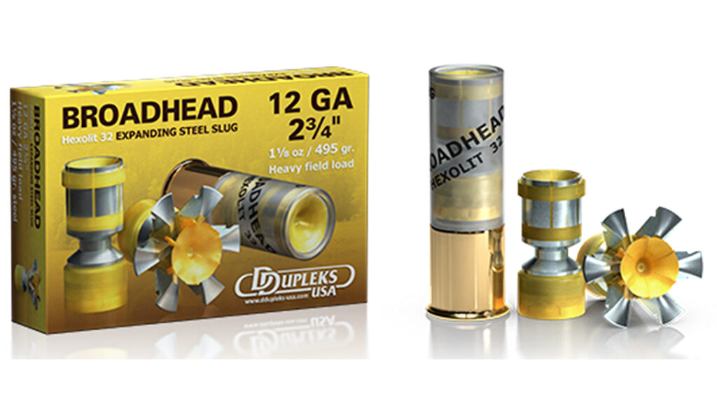 An innovative design meant to take down large game, this shotshell imparts a devastating blow to its target. Built with a 495-grain slug flying at 1,400 fps from the muzzle, the magic of this shell can only be appreciated upon impact. Once making contact with the intended game, the innovative hollow-point ogive gives way to six breakaway petals. So, not only do you have a solid slug penetrating deep into the target, but six additional wound channels from the fragmentation of the aforementioned break-away petals. Safe for use in all barrels and lead-free for restrictive hunting grounds. (ddupleks-usa.com)