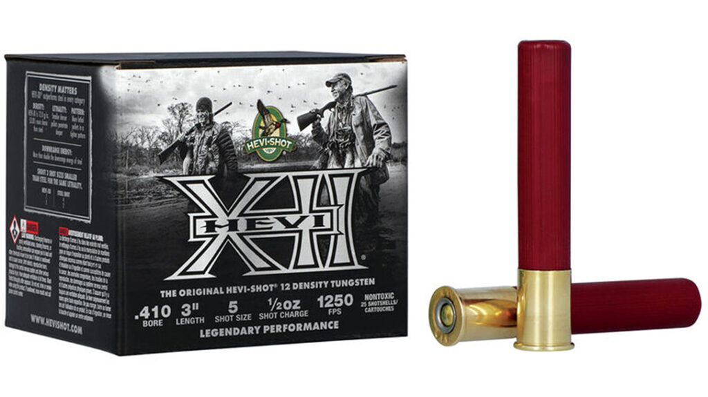 Expanding upon the Hevi-III, new for 2024 is a #5 and a #7 shot in .410. Packed with a healthy serving of tungsten shot, the tight-patterned hit delivered on an unsuspecting turkey is quite impressive. Outperforming steel with optimized cold-weather performance and the added benefit of being lead-free have many a hunter considering swapping over to .410, no longer viewing it as an “underpowered-shotshell.” (hevishot.com)