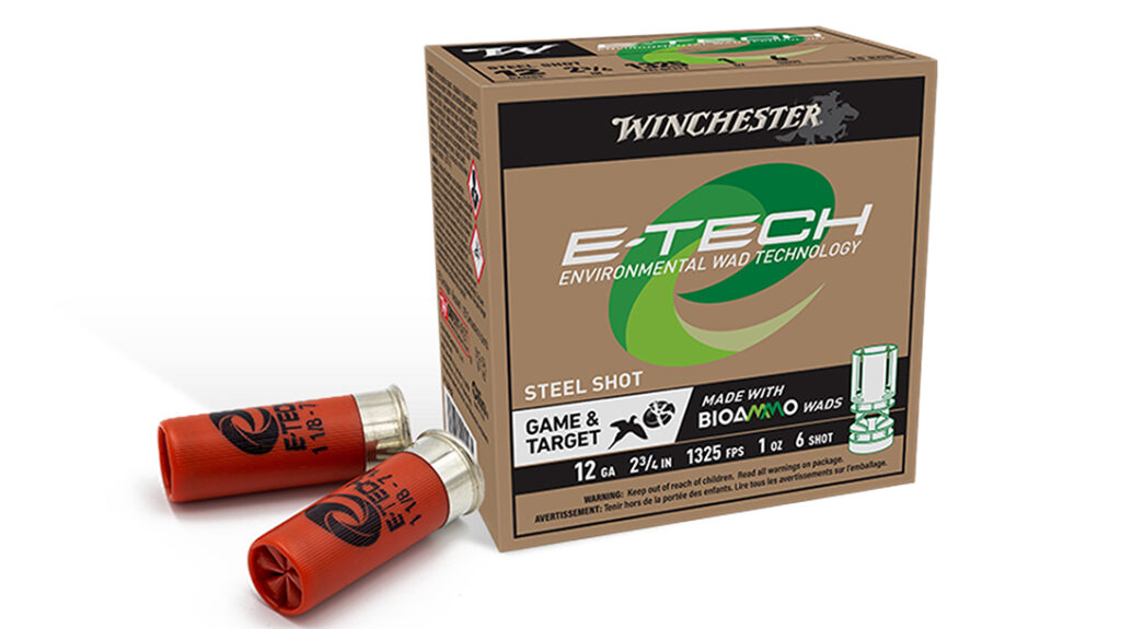 Winchester E-Tech shotshells incorporate innovative BioAmmo wads made from bio-polymers, mimicking traditional plastic in both appearance and performance. These environmentally friendly shells ensure consistent muzzle velocity by tightly sealing expanding gases with its bio-polymer over-powder wad. These wads can withstand extreme pressures and velocities, while guaranteeing optimal pattern performance, delivering uniform and consistent patterns similar to their traditional plastic wad counterparts. (winchester.com)