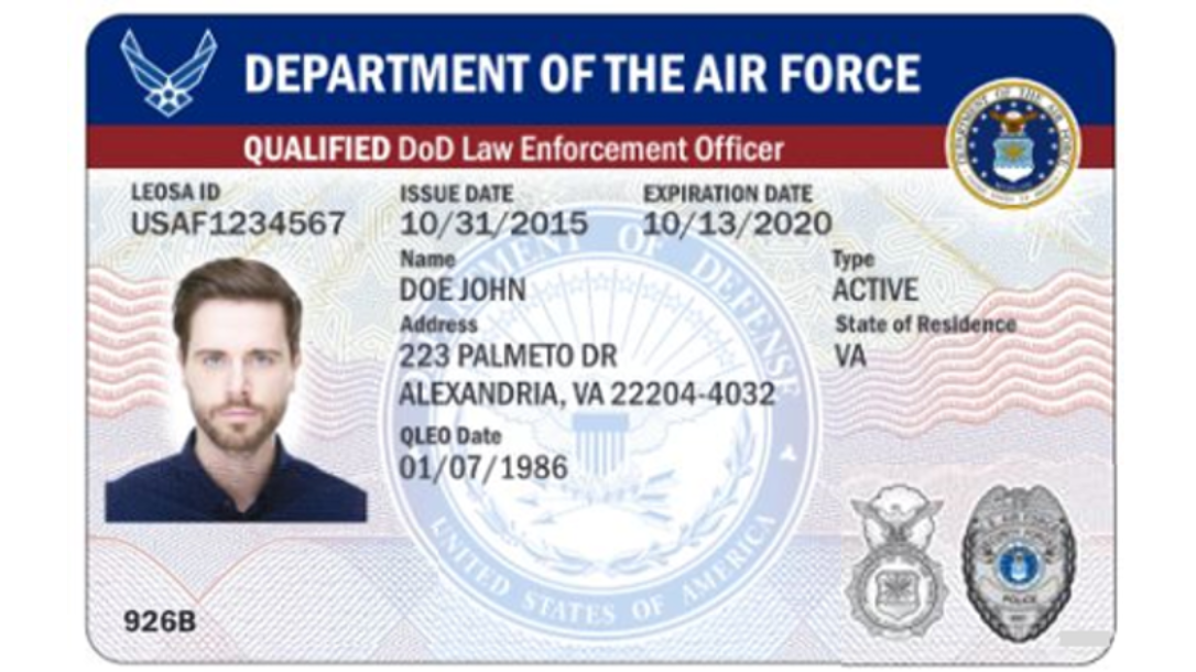 Many state and federal agencies issue LEOSA ID cards. It doesn’t matter if the agency is in the QRLEO’s state of residence or not. Some New Jersey agencies already issue these LEOSA identifications and most federal agencies do as well. This is a sample LEOSA card from the Department of the Air Force. Any department in New Jersey may now issue similar credentials.