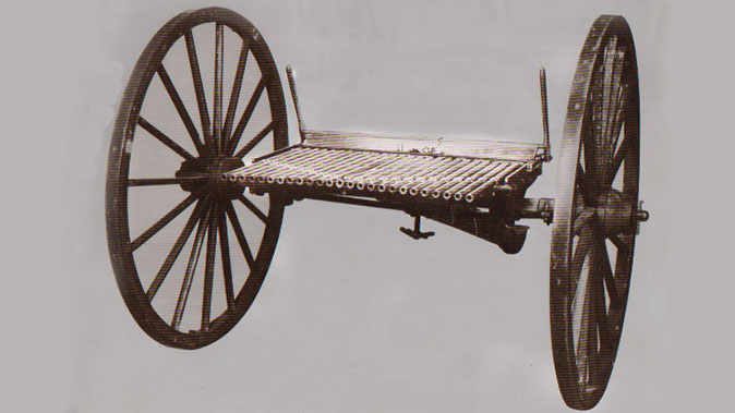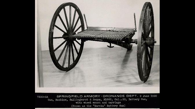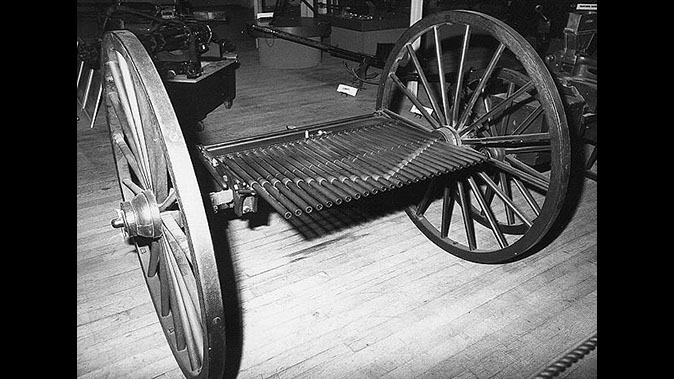 The design for the Billinghurst-Requa battery gun included 25 barrels mounted horizontally to a wheeled carriage. A clip holding twenty-five .52-caliber metallic cartridges was loaded in front of a bar at the barrel breeches. When the attached lever was manipulated, the cartridges were pushed forward into the barrels and the hammer on the single percussion cone was cocked.