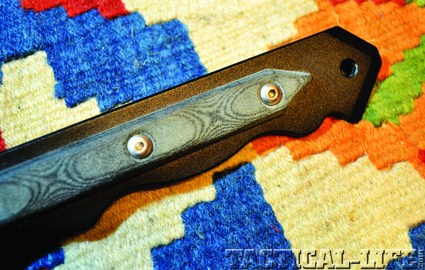 The 6.5-inch handle is covered with two slim scales made of Micarta. The tactical finger-grooved handle is about 0.75 inches thick by about 1-inch wide. In the terminal end of the handle there is a 0.25-inch lanyard hole that I found nice as most lanyard holes are somewhat smaller, thereby limiting the size of cord or rawhide you can use. At the very peak of the handle there is a nicely formed blunt-force trauma device.