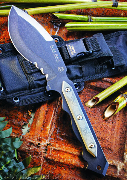 When I first received the CUMA TAK-RI I examined it closely. I found it to be all that TOPS Knives are expected to be in quality and finish and could see Johnny Tsai’s reasoning for the weight, size and general design. The knife was light and nimble, which is a must for a CQC weapon. The 7-inch partial double-edge and partially serrated blade is 3/16-inches thick and fashioned from 1095 High Carbon Steel.