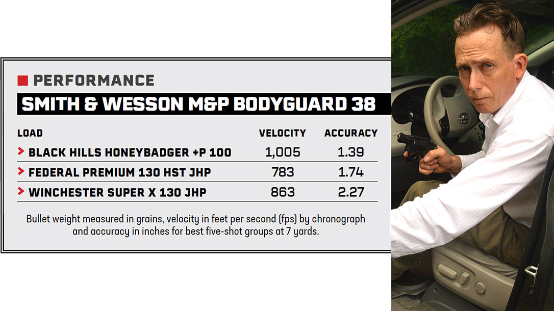 Testing the Bodyguard 38 at 7 yards with a standing, two-hand hold, I found it shot at least as well, if not better, than my old Model 649 and 36. Of the three distinctly different +P defensive loads for snubnoses I tested, all of them seemed to hit about an inch low and 1.5 inches to the left of my perceived point-of-aim.