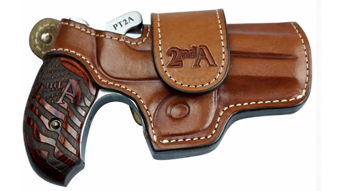 The pistol comes chambered in .38 Spl./.357 Mag or .45 LC/.410 bore. Each comes with an included BAD premium leather holster as well. It sports white stitching and “2nd A” markings. The PT2A retails for $887, money well-spent. For even more info, please visit bondarms.com.