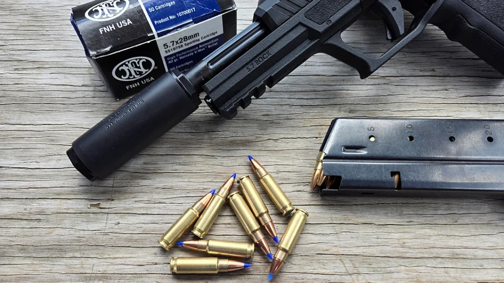 Last but not least on the handgun front is the 5.7 Rock. Keep in mind that although the Bitty is rated for rounds other than .22 LR that doesn’t mean it’s always hearing safe. Bowers notes that it will make .22 Magnum hearing safe from a rifle, but otherwise all it does is knock down muzzle blast and reduce the noise. So why would you want that? Well, if you’ve ever shot a 5.7x28mm pistol unsuppressed you know that it has quite a bit of blast and report.