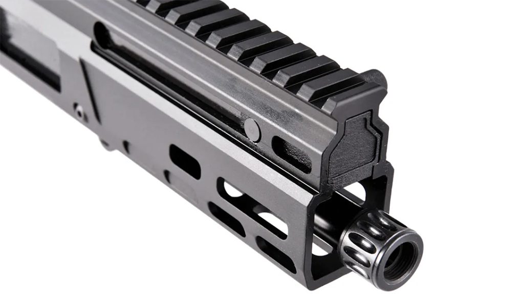 This complete upper, owing to the blowback operating system, also comes without a buffer assembly. So that means this bad boy can utilize all folding stock variations, or builders can maintain a straight pistol design. Of course, when building a 9mm SBR, all NFA rules still apply.