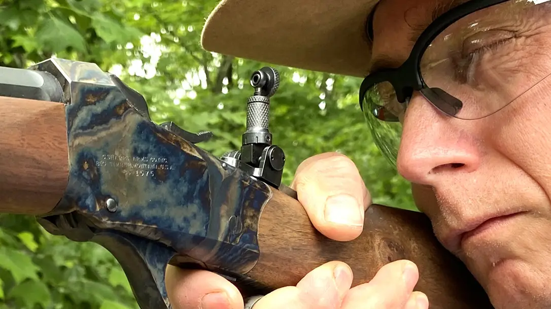 Shooting the C. Sharps Arms from the bench with a rest under the forend and butt, I tested accuracy at 50 feet with the standard buckhorn and blade sights and quickly decided my eyes could no longer manage buckhorn sights. When I switched to a tang-mounted aperture rear sight, it cut my group sizes down an average of 43%. In fairness, this gun is configured as a hunting rifle for which the standard sights are fine. In fact, the rounded top of the German Silver front blade reflects enough light to shine so it will stand out in the dark forest. For deliberate bullseye shooting, the standard sights caused me to string my shots vertically.