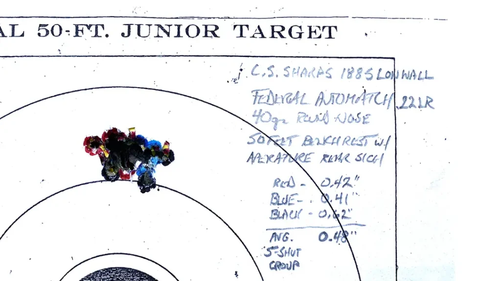 I regret that I didn’t have any true match grade .22LR on hand when I did my testing. Still, I had three loads that performed quite decently. Winchester Sub Sonic 42 MAX, with a 42-grain hollow point bullet, averaged groups of 0.43 inches and 1,051 feet-per-second (FPS). Federal Auto Match with a 40-grain lead round nose bullet shot average groups of 0.48 inches and 1,147 FPS. Remington Thunderbolt High-Velocity 40-grain lead round nose bullets produced five-shot groups averaging 0.54 inches and 1,109 FPS.