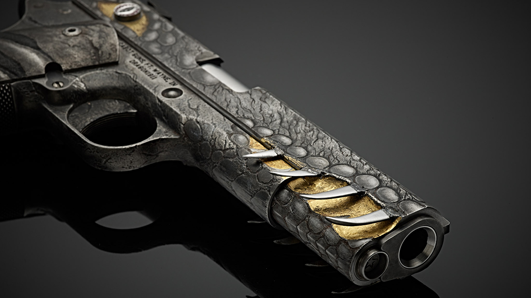 Master Engraver Lee Griffiths goes in directions seldom seen in firearms with the Dragon Fire. A fully functional 1911 in .45 ACP, the sculpted masterpiece pairs with a one-of-a-kind oil painting. That combination enables the owner to display arguably the most unique firearm in the world.