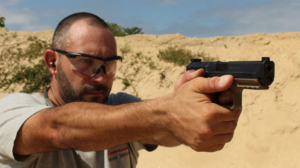 Canik also made sure that the slide would be easy to manipulate by including cocking serrations both fore and aft. In addition, the company angled the rear sight forward. This provides a sturdy lip that can be racked against a rigid object if you’re down to one hand in a fight.