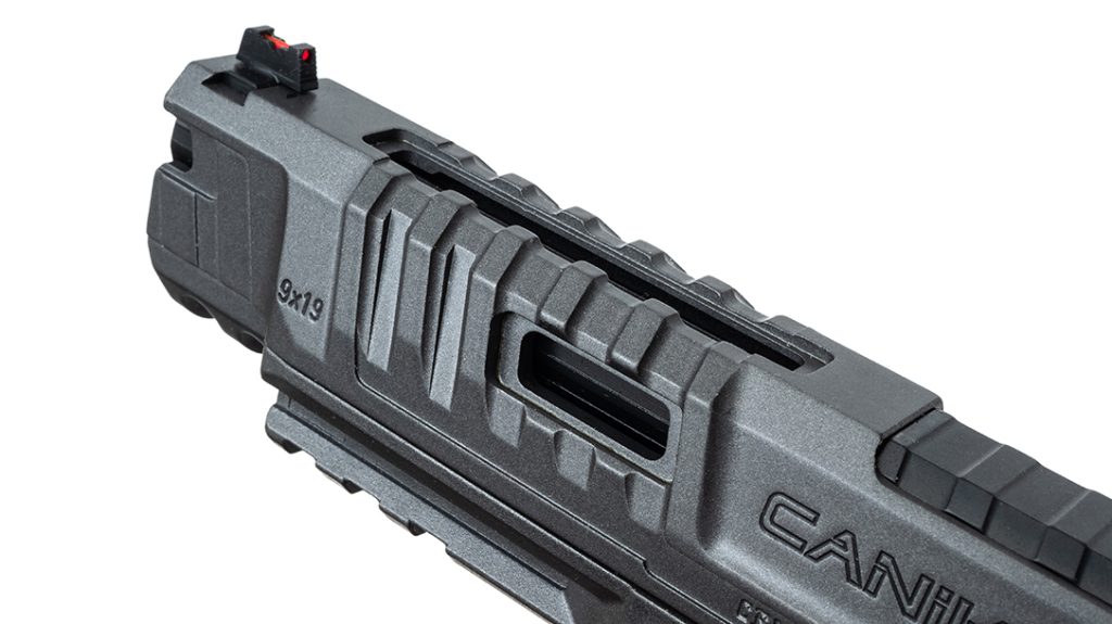 The frame also includes the ambidextrous slide stop as well as the double undercut triggerguard for increased shooter comfort. The Rival wears the same improved and aggressive grip texturing as the METE line, and it includes Canik’s holster fit-and-lock system for secure retention. Sporting the same redesigned beavertail, the Rival ships with three backstraps for a custom fit. It includes a magazine well that attaches to the grip at the user’s discretion.