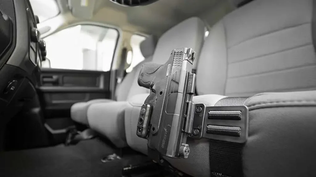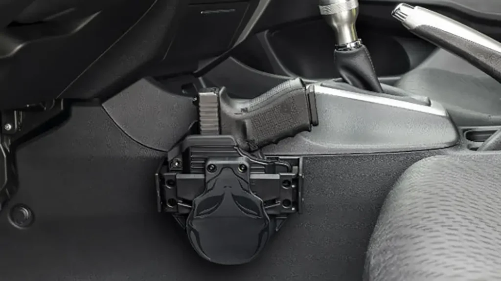 Carrying on the body is easiest when trying to get in and out of your car, but there are also methods of carrying off the body while driving. There’s no shortage of vehicle holsters, safes, and retention devices that can be found to help solve this challenge. Regardless of the device you choose, if you go that route, there are a few essential things to consider. First off, the gun must be truly secure. If you are in a car accident, it is less than optimal to have your steel pistol bouncing around inside your car. The secondary point of concern is accessibility. While some vehicle gun safes are great for keeping things secure, they can make getting to your gun during an emergency challenging. As always, you’re balancing safety and accessibility.