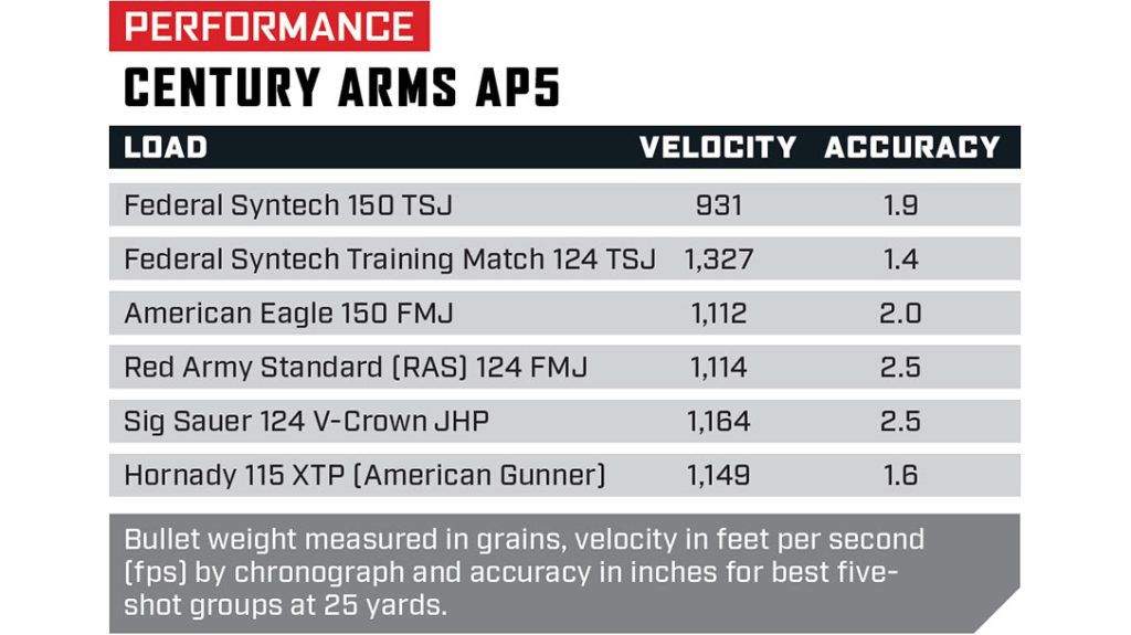 The only malfunctions were the ones that were self-induced to get a complete feel for the AP5. A variety of ammo was shot, including FMJ, TMJ, JHP, TSJ and others. Federal’s Syntech Training Match 124-grain TSJ netted a 1.4-inch grouping at 25 yards using a Kopfjager CF Tripod w/ Reaper Grip.