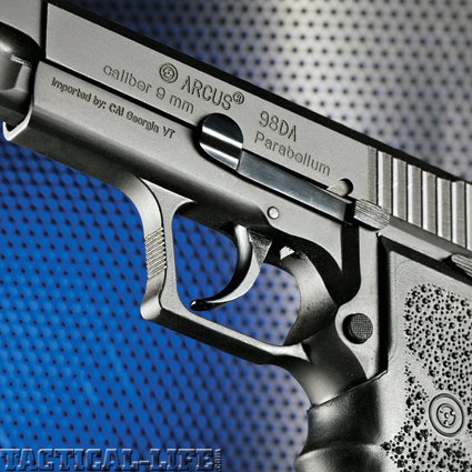 One of the most significant areas of divergence from the Hi-Power in the 98DA’s design is the double-action trigger system. Note the large, squared triggerguard.