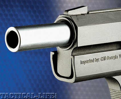 The 4.66-inch barrel of the Arcus 98DA mates directly to the Hi-Power-style slide through an integral bushing, and there is no full-length guide rod system located under the barrel assembly. The front sight assembly, which features a white dot, is situated in a dovetail slot.
