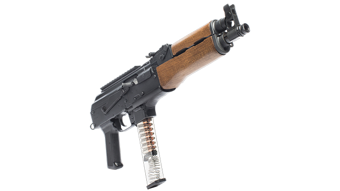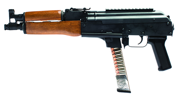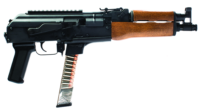 The blowback operated Draco NAK9 also sports a stamped receiver and a wooden AKM handguard. The overall length of the gun is 19.1 inches and it tips the scales at 6.38 pounds.