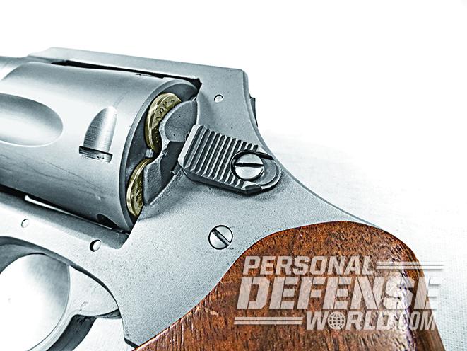 The coarsely serrated cylinder latch ensures the shooter’s thumb does not slip when swinging out the cylinder, or a shooter can pull on the knurled end of the ejector rod to swing out the cylinder. The ejector rod is not shrouded. The rod features a sleeve that snaps into the front of the frame. When the cylinder is closed, a pin in the center of the ejector fits into the rear of frame, locking up the rear of the cylinder. Finally, the Boomer weighs only 20 ounces unloaded.