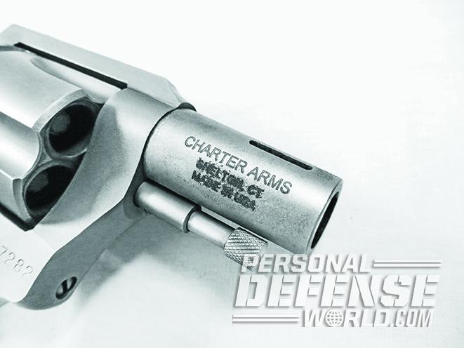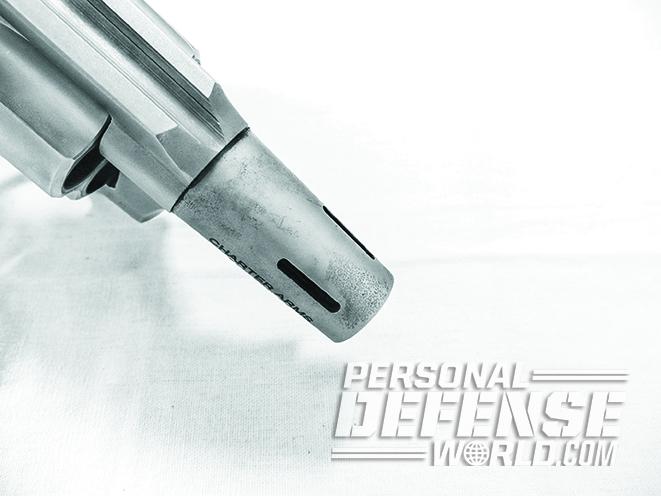 Silvertip HPs. I am always amazed at how Charter Arms designed its .44 Special revolvers, packing five rounds of .44 Special power in a space that most other manufactures put five .38 Special/.357 Magnum cartridges. Since the Boomer has no sights, except the groove in the topstrap, there was less aiming and more pointing. This snubbie is designed for very close work, so I placed targets at 7 yards and most of my five-shot groups were 4 inches on average. When I concentrated and pointed the Boomer consistently, I shot two- and three-shot clusters that nearly touched. The Boomer is accurate, but since the sights have been stripped off, precision is not part of its vocabulary. That’s about what I expected. The Boomer excels in quick point shooting. The ported barrel allowed me to get back on target faster with less muzzle flip when shooting rapidly. The recoil was also quite comfortable.